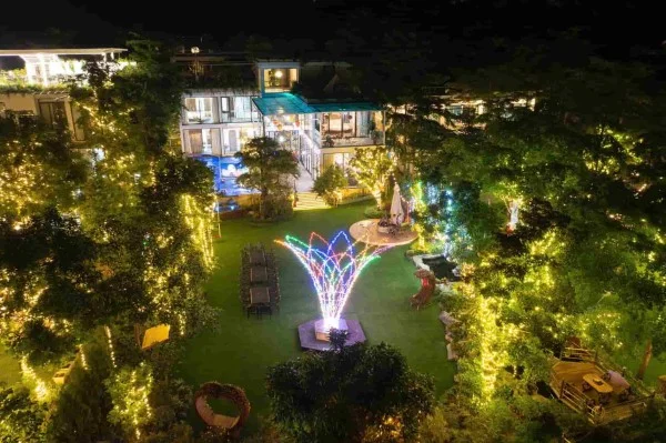 Sân vườn 800m2: Không gian lý tưởng cho các buổi Gala Dinner, tiệc cưới hoặc Team Building. Sân vườn đã có sẵn khung sự kiện và hệ thống đèn trang trí lung linh, lộng lẫy vào ban đêm.