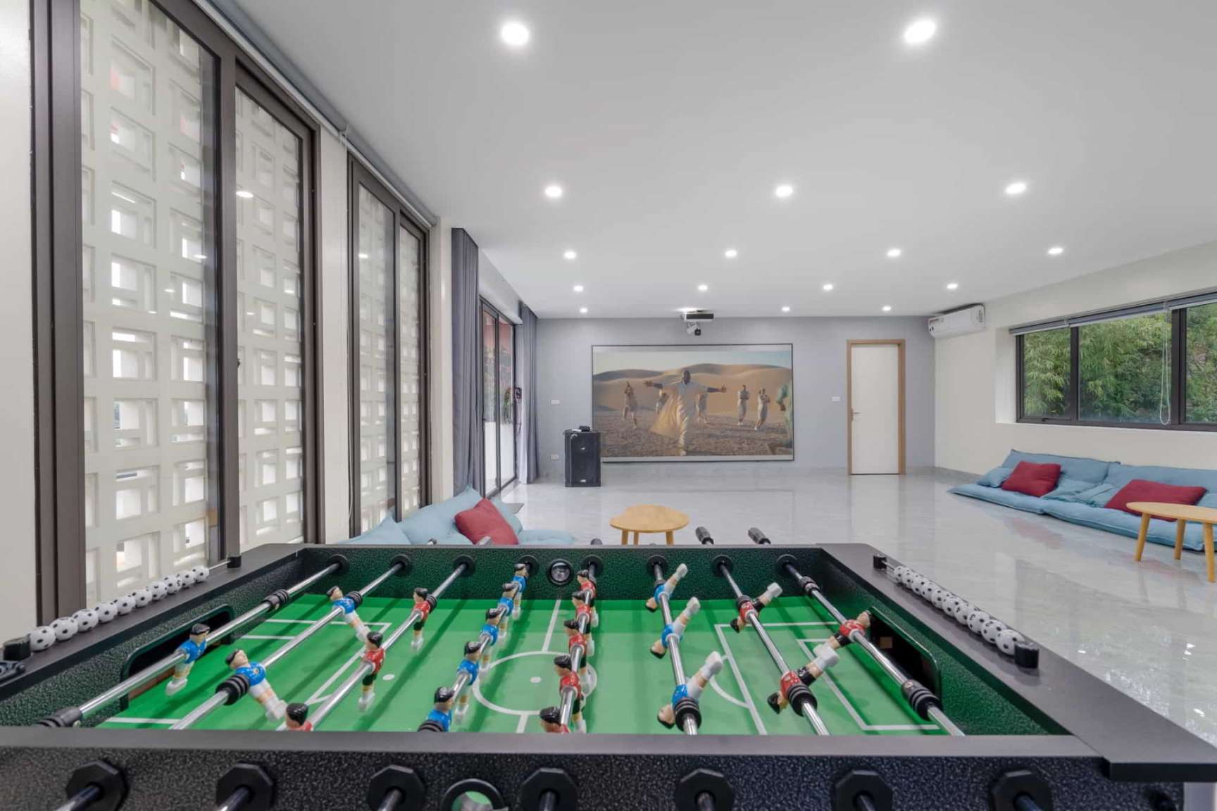 Phòng xem phim chuyên dụng: Trang bị máy chiếu hiện đại, màn hình lớn và hệ thống 9 ghế sofa êm ái. Đã sẵn sàng tài khoản Netflix để bạn "cày" phim xuyên màn đêm.