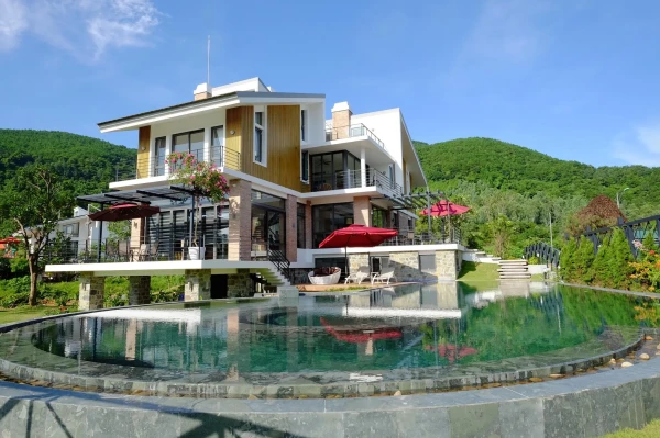 Villa rộng, thiết kế hài hòa nhìn kiểu hiện đại mà vẫn giữ vibe ấm cúng. Bể bơi ngoài trời mát lạnh, buổi sáng ngắm sương mờ lên mặt hồ thấy nhẹ hồn luôn.