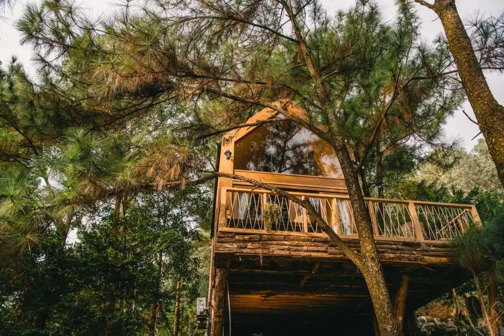 Xung quanh có nhiều homestay Sóc Sơn dạng nhà gỗ, cabin giữa rừng thông.