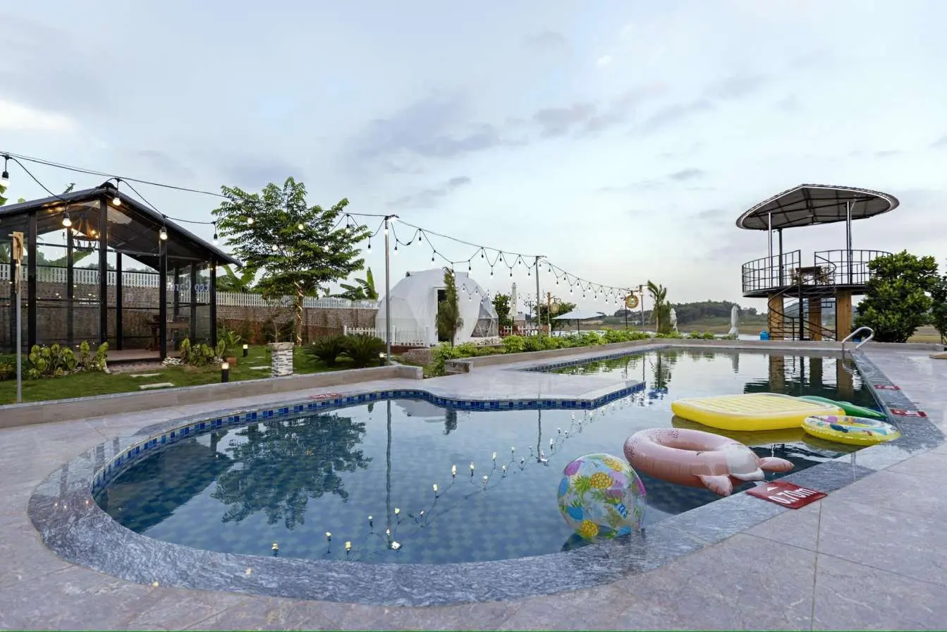- Tiện nghi: Bể bơi vô cực, khuôn viên rộng, nhà gỗ.