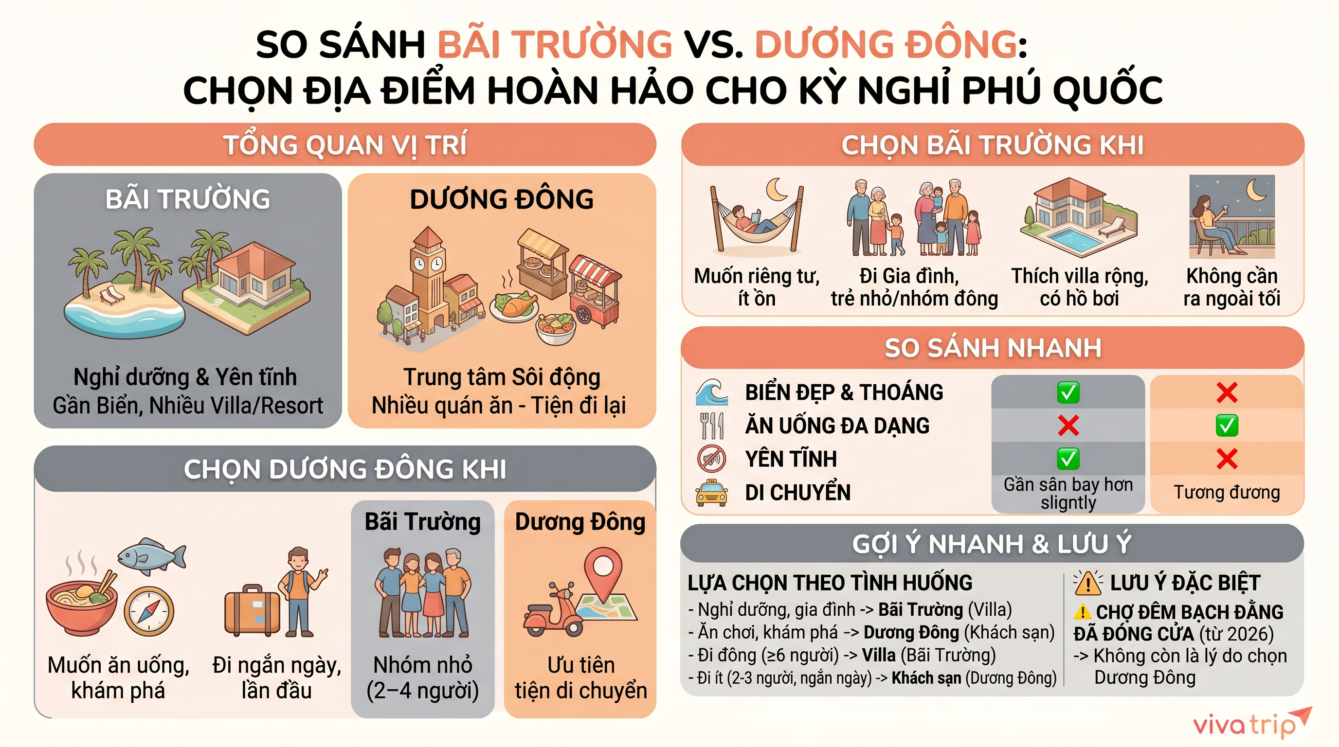 Lưu ý thực tế quan trọng: Nếu bạn chọn Dương Đông vì chợ đêm Bạch Đằng — cần biết rằng chợ đêm Phú Quốc đã dừng hoạt động sau Tết Nguyên đán 2026, theo quyết định của UBND đặc khu Phú Quốc nhằm sắp xếp lại trật tự đô thị.